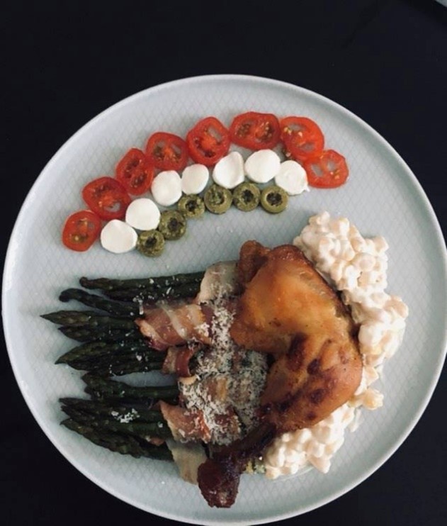 Ünnepi étel – mézes-mustáros csirkecomb baconba tekert parmezános vajban sült spárgával és majonézes kukoricasalátával, díszítésként mozzarellával, paradicsommal és pesto-s olívabogyóval