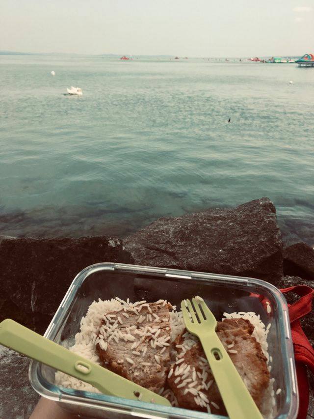 Aztán elérkezik az utolsó nap és egyben első alkalom, hogy közösen eszünk. Találunk egy biztonságos gluténmentes helyet, ami viszont csak csütörtökön, a hazaút napján van nyitva a héten. Elhalasztjuk az indulást (ami később rossz ötletnek bizonyul, mert a buszon annyian lesznek, hogy leülni sem tudunk) és betérünk a hamburgerezőbe. Izgulás vesz erőt rajtam. Vajon nem csap-e be az agyam? Tudok vajon jó szívvel enni egy olyan ételből, amit számomra ismeretlen ember, ismeretlen körülmények között készít? Rá tudom-e bízni a szakácsra az egészségem? Éhes vagyok, sikerül átlendülni a félelmen. Majdnem egy hét után lakom jól. Az utazások alatt bár mindig viszek magammal ételt, de a Balatonra zömmel szendvicset és különböző rizses egytálételeket pakolok. Praktikus okokból, mivel laktató és nehezen romló fogások, ráadásul ide már nem kocsival megyünk, így limitált a dobozmennyiség. A barátom sportot űz abból, hogy minél kisebb csomaggal utazzon, ami egy örökké piknikező gluténérzékennyel folyamatos frusztrációt szül. Végül kompromisszumot kötünk, fejenként egy nagy hátizsákot viszünk. Utólag belátom, hogy a rizs bár tényleg megfelel a kritériumoknak, de nagyon unalmas. Hamar csömöröm lesz tőle így inkább maradok a szendvicseknél.