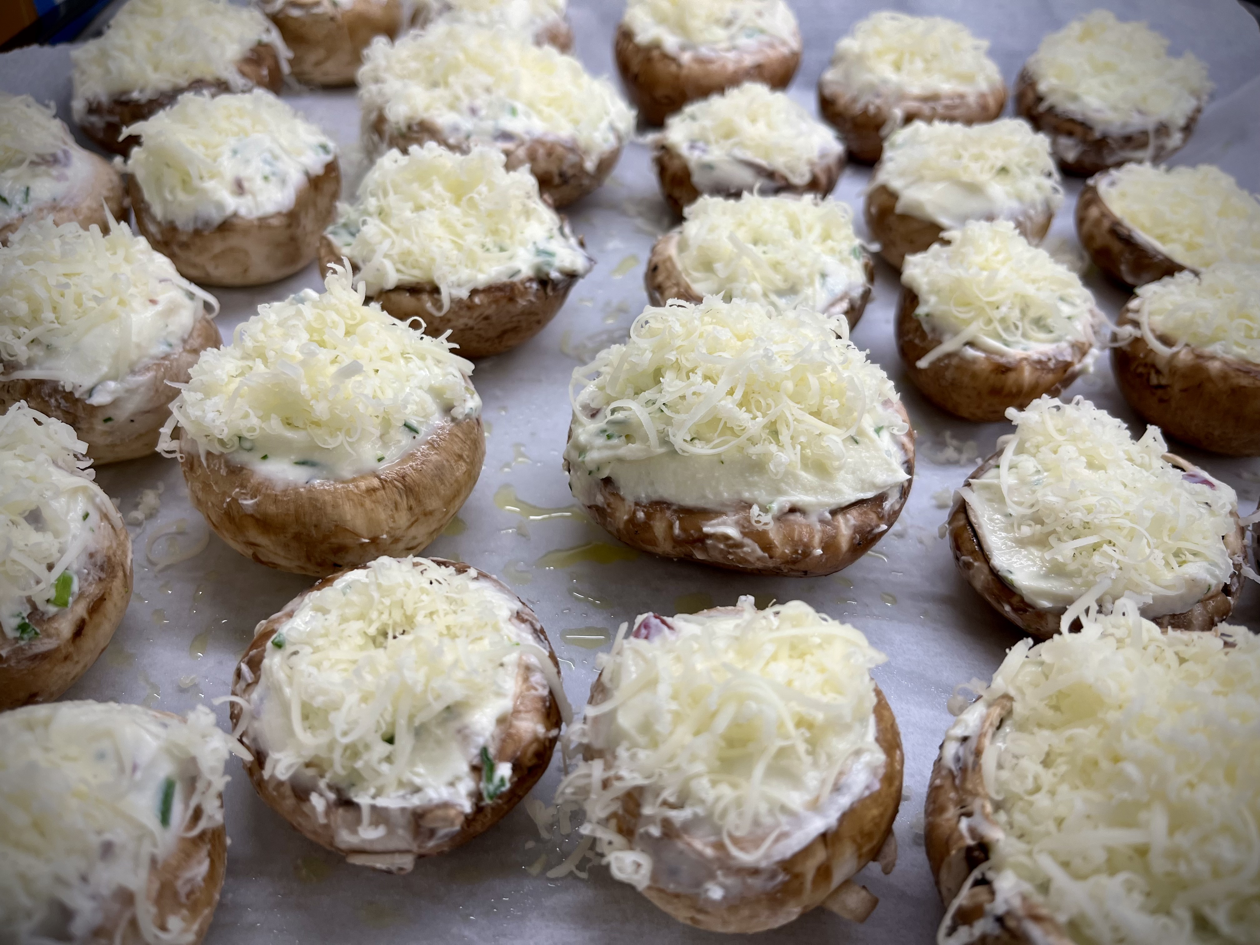 A töltött gombafej következik. Ezeket hideg vízzel átöblítem (nem jó áztatni, mert sok vizet felszív a gomba), majd levágom a szárait. Ahhoz, hogy minél több juhtúró férjen a fejbe, egy kiskanalat vagy még jobb, ha karalábévájót fogok és kis mélyedést vájok ki a gombafej belsejéből. Sok recept felhasználja a gomba szárát, én most ezt nem teszem. Ezután összeállítom a tölteléket. Összekeverem a juhtúrót pár kanál Mascarponé-val azért, hogy kicsit fellazítsam. Tényleg nem kell sok, a lényeg, hogy a túrót kanállal tudjam keverni. Olyan lesz, mint egy formázható gyurma. Ezt követően beletöltöm a felaprított lilahagymát (sonkahagymát használtam, de a sima is megfelel), majd felaprítom a zöldeket: a petrezselymet és metélőhagymát. A kapor ideális a juhtúróhoz, nekem most be kellett érnem a másik kettővel. Kis kanállal óvatosan megtöltöm a gomba kalapját egészen a tetejéig. Megismétlem mindegyik darabbal, majd a végén reszelt sajtot rakok a tetejükre - trappistát.